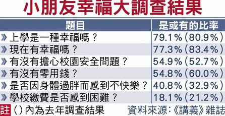 調(diào)查結(jié)果顯示,約77%受訪學(xué)童覺得幸福,比率是繼2004年的74%及2003年的76%之后,調(diào)查進行十年來的第三低。臺灣小學(xué)生覺得幸福的主因是“溫暖的家、與父母同樂”,不幸福的原因則是課業(yè)問題。