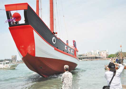 仿鄭成功時(shí)期戰(zhàn)船打造的“臺(tái)灣船”昨天在臺(tái)南市安平港下水,市民搶著拍照,見證歷史一刻。圖片來源:臺(tái)灣《聯(lián)合報(bào)》