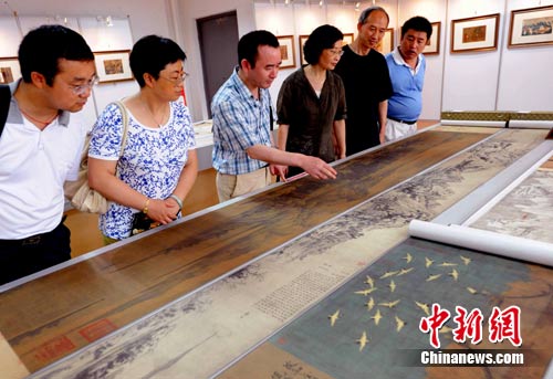 7月8日,觀眾在福州舉辦的“兩岸故宮高仿真宮廷畫聯展”上被展出的一幅合璧版仿真《富春山居圖》所深深吸引。《富春山居圖》是元朝畫家黃公望的代表作,是其為無用師和尚所繪,以浙江富春江為背景,全圖用墨淡雅,山和水的布置疏密得當,墨色濃淡干濕并用,極富變化,被譽為中國十大傳世名畫之一,其流傳經歷充滿傳奇色彩,目前兩岸各存一段。據了解,此次“兩岸故宮高仿真宮廷畫聯展”共展出130余件高仿真作品,囊括了隋唐五代、宋、元、明、清和近代各個時期書畫名家的傳世佳作。