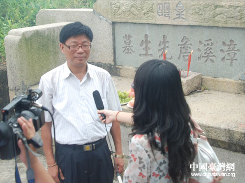 臺(tái)灣詹氏宗親總會(huì)秘書長(zhǎng)詹儒德在“詹御史”墓前祭拜,并接受采訪。(漳浦縣臺(tái)辦 陳文亮 攝)
