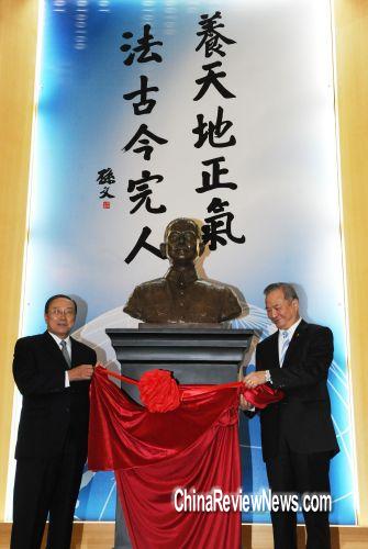 “考試院”6日舉行孫中山銅像揭幕典禮,“考試院長”關(guān)中(左)與副院長伍錦霖(右)一起為這座“辛亥百年第一尊”的孫中山銅像揭幕。