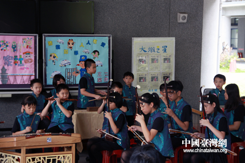 5月29日下午,來自臺中市大墩小學民族樂團的小朋友們為參訪團演奏了一首古典韻味的樂器協奏曲。(中國臺灣網 李丹 攝)