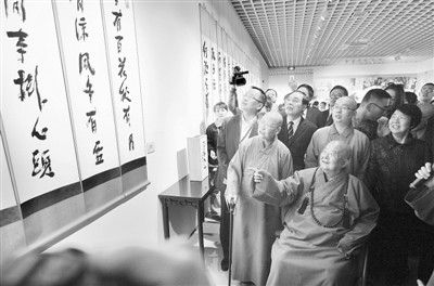 圖為星云大師(前排右一)與觀眾一同參觀《一筆字》展覽。中新社記者 泱 波攝