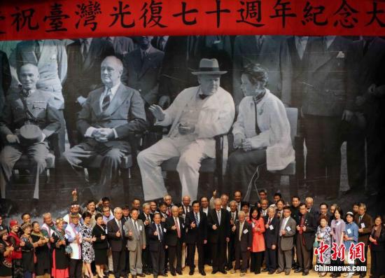 10月25日,臺灣方面在日本受降所在地臺北公會堂(現(xiàn)中山堂)舉行光復(fù)70周年紀(jì)念大會。社會各界以及臺灣抗日志士、先賢先烈家屬代表等千余人出席活動。臺灣當(dāng)局領(lǐng)導(dǎo)人馬英九出席紀(jì)念大會致辭并與臺灣抗日志士、先賢先烈家屬代表合影留念。(中新社記者 任海霞 攝 )