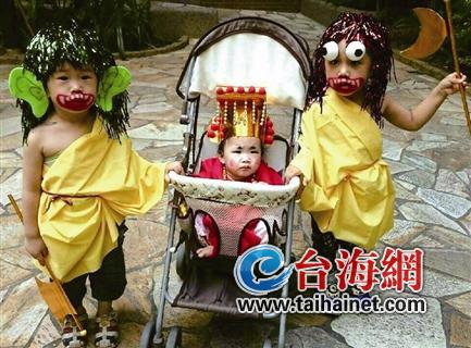 先是網友在社群網站上貼出3個孩子的KUSO照,分別被扮成“媽祖”、“千里眼”和“順風耳”,中間的“媽祖小萌娃”無奈皺眉超可愛,一旁千里眼吊著2顆大眼珠也讓人笑歪。其他網友接著分享自家孩子扮成“黑白無常”的照片,搞笑程度同樣破表。