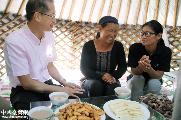 滕鴻年來到達(dá)日丹(左一)家蒙古包,與其父母話家常。(中國臺灣網(wǎng) 王思羽 攝)