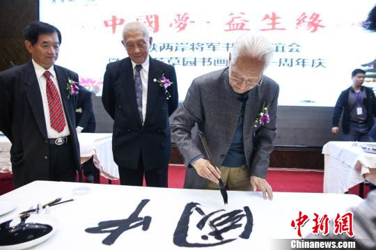 當(dāng)天,兩岸老將軍們在中國傳統(tǒng)文化上,找到了共同語言,揮毫潑墨,并和青年學(xué)子共同書寫“同心同德兩岸情,同宗同源一家親”、“風(fēng)雨重陽后,同舟共濟(jì)時(shí)”等書法作品。