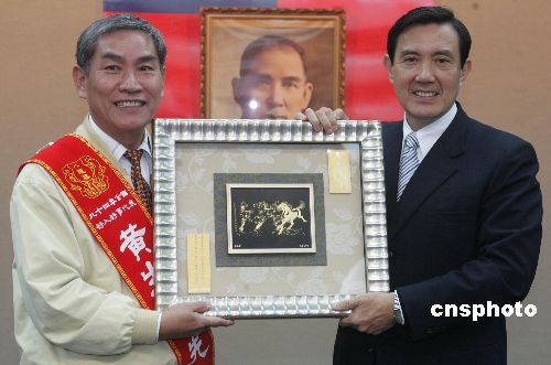 中國(guó)國(guó)民黨主席、臺(tái)北市長(zhǎng)馬英九十二月十二日在臺(tái)北會(huì)見(jiàn)全臺(tái)好人好事“八德獎(jiǎng)”獲獎(jiǎng)代表時(shí),一位代表贈(zèng)送他一幅“九馬圖”,祝其前程遠(yuǎn)大。作者:宗金柱