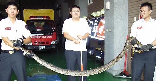 臺(tái)中市東英消防分隊(duì)昨天捕獲一條蟒蛇。(圖:東森新聞)