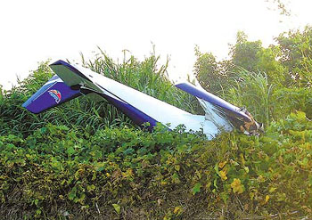 彰化縣芬園鄉(xiāng)貓羅溪畔農(nóng)地15日發(fā)生輕航機(jī)墜機(jī)意外,機(jī)上一男一女受重傷,經(jīng)警方調(diào)查后,證實(shí)機(jī)上男女分別為航天公司老板褚信坤及妻子游鑫桂,肇事原因不明 來源:臺灣《中國時報》