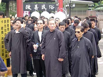 據臺灣中時電子報報道,2005年5月,在島內素有“黑道仲裁者”之稱的“蚊哥”許海清舉行喪禮,全臺各幫派動員上萬人以“輸人不輸陣”的氣勢,身著各幫派及堂口制服,甚至以“黑色人龍”之姿繞街游行臺北街頭,甚至高調的舉辦記者會,訂定“黑道平安日”,讓警方顏面無光。臺“警政署”最后施以鐵腕,日后的任何一場黑道份子喪禮,均事前強力約制幫派份子參加,甚至強力掃蕩,昔日黑道喪禮的風光,幾乎已不復見。
