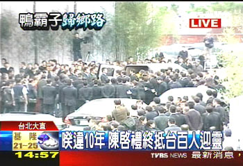 陳啟禮的喪禮上來自臺灣與香港的黑衣男女等數百人迎接。(圖:臺灣TVBS)
