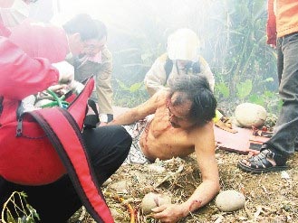 一名傷者滿臉鮮血,赤裸著上身,在現(xiàn)場(chǎng)哀嚎,救難人員正準(zhǔn)備將他抬上擔(dān)架送醫(yī)。《聯(lián)合報(bào)》記者段鴻裕攝