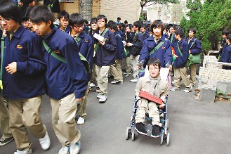 新竹中學生林柏廷患肌肉萎縮癥,同學都很幫忙他。(聯合報圖)
