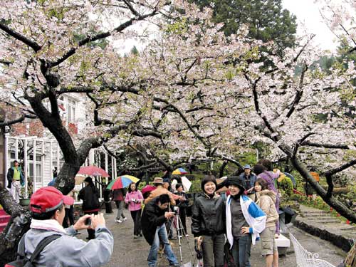 中國臺灣網2月4日消息 據臺灣《聯合晚報》報道,島內景氣差,造成各風景區游客驟減,但也有不少新舊景點靠創意、創新,殺出重圍。這幾年來,阿里山森林游樂區的步道等游憩設施改善,加上新年日出音樂會、櫻花季等活動打響名號,最近幾年游客回升,前年更逼近100萬人次。圖為阿里山回春,游客聚集在櫻花樹下。(周先)