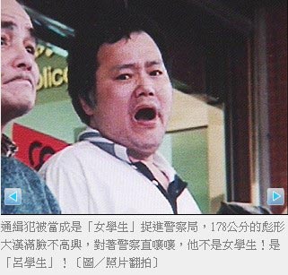 呂學生被當成是“女學生”捉進警察局,身高178厘米的彪形大漢滿臉不高興,他對著警察直嚷嚷,說他不是“女學生”。