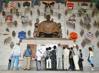 臺當局推行“去蔣”政策,臺北中正紀念堂的蔣介石銅像被各式風箏遮擋。4月1日起風箏等將全部拆除,還大廳原貌。(圖:臺灣《聯合報》)