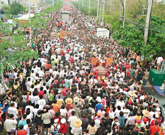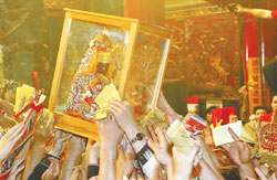 中新網(wǎng)4月14日電 經(jīng)過(guò)八天七夜繞境出巡,臺(tái)灣大甲媽祖神轎昨天回鑾到臺(tái)中縣大甲鎮(zhèn)。超過(guò)十萬(wàn)名接駕信眾綿延十多公里。信眾的熱情,讓回鑾的預(yù)定時(shí)間比去年更延遲好幾個(gè)小時(shí),家家戶戶備妥香案跪拜,鎮(zhèn)瀾宮深夜十一點(diǎn)舉行安座大典,場(chǎng)面盛大熱情。