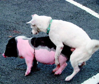 麝香豬的女主人,在嘉義市一家洗車場(chǎng)任洗車工,前天下午帶著麝香豬“曼尼”到洗車場(chǎng),就讓愛豬在空地閑逛。一只十歲的土狗“拉奇”看到麝香豬后立即沖上前,麝香豬受到驚嚇,發(fā)出刺耳的尖叫四處逃竄,土狗卻硬將麝香豬“撞倒”,接著聞遍全身,最后“侵犯”了麝香豬。