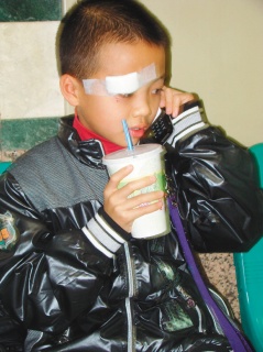 大陸旅游團(tuán)團(tuán)員傷者徐思倫,打電話向親戚報(bào)平安。(臺(tái)灣《聯(lián)合報(bào)》圖片)