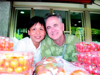 原是CNN亞特蘭大制作人的任卡爾(右)與妻子謝佩玲在南投縣栽培無農藥西紅柿,找到樂活園丁新生活。圖片來源:臺灣《聯合報》