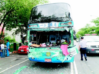 臺中縣東勢鎮慈蓮慈惠堂進香團游覽車追撞,14人輕傷。圖片來源:臺灣《聯合報》