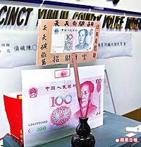 中國(guó)臺(tái)灣網(wǎng)9月2日消息 一群原從事特種行業(yè)的臺(tái)灣年輕男女,因景氣欠佳,酒店生意不好,集體轉(zhuǎn)行從事詐騙業(yè),專門騙大陸民眾,日前詐騙一名精明的臺(tái)商遭識(shí)破,臺(tái)商打反詐騙電話報(bào)警。臺(tái)灣警方昨攻堅(jiān)時(shí)發(fā)現(xiàn)嫌犯竟將人民幣影印放大,上香膜拜,就連電腦屏幕桌面也是人民幣圖像,不禁笑罵:“真是想錢想瘋了!”