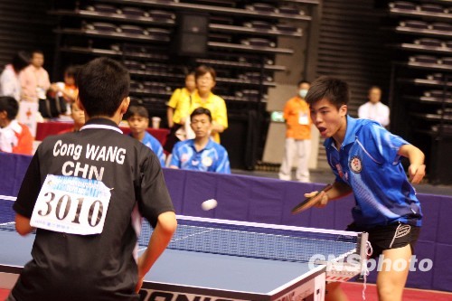9月6日,第21屆聽障奧運(yùn)會(huì)賽事首日,中國隊(duì)全面出擊,參加乒乓球、籃球、羽毛球等多個(gè)項(xiàng)目比賽。上午在臺(tái)北小巨蛋率先登場(chǎng)的乒乓球男團(tuán)比賽,3名中國聽障小伙子出場(chǎng),3:0擊敗中國香港隊(duì)。圖左為中國聽障運(yùn)動(dòng)員王聰。 中新社發(fā) 董會(huì)峰 攝