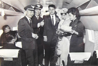 高家成(中)、潘清珍(右二)46年前在華航機上成婚,華航開香檳、送結(jié)婚蛋糕慶祝,拍下島內(nèi)首次空中婚禮的歷史畫面。