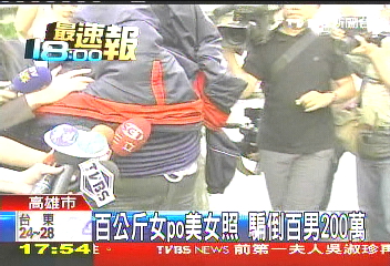 據(jù)臺灣TVBS電視臺報道,這名犯罪嫌疑人尤小姐,現(xiàn)年27歲,身高170公分,體重上百公斤,但卻冒用漂亮女網(wǎng)友的照片,在網(wǎng)路聊天室化名雯雯、小娟、嘉恩等6種名字,騙了100多個男網(wǎng)友,3年來騙到200萬元,其中一名在鋼鐵業(yè)工作的男子被騙最多。高雄市刑大分隊長顏大晉:“最高(金額)的被害人,一次就被他前后總共被騙105萬。”