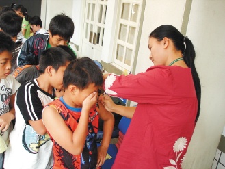 那瑪夏鄉民生小學學生在寄讀的鼓山小學接種新流感疫苗,有些學童害怕看針筒而捂著眼睛。 來源:臺灣《聯合報》