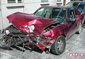 黃清海撞車后車頭全毀(下),后遇警員竟跳湖躲在岸邊樹叢(上)。來源:臺灣《蘋果日報》
