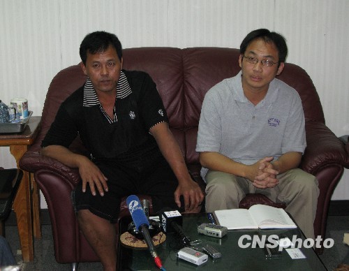 去年4月在西印度洋遭索馬里海盜挾持的臺灣遠洋漁船“穩發161號”,終于在遭挾持10個多月后,經大陸海軍526艦接護返回高雄港。圖為3月6日“穩發161號”船長顏勝男(左)、穩發漁業公司經理劉銘復(右)在高雄接受大陸記者采訪,他們感謝大陸船東協會提供及時幫助、海軍提供柴油、伙食和護航。 中新社發 耿軍 攝