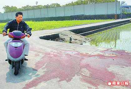 劉彥聰在路上被砍死,地上留下大灘血跡,行人途經紛紛走避。 來源:臺灣《蘋果日報》