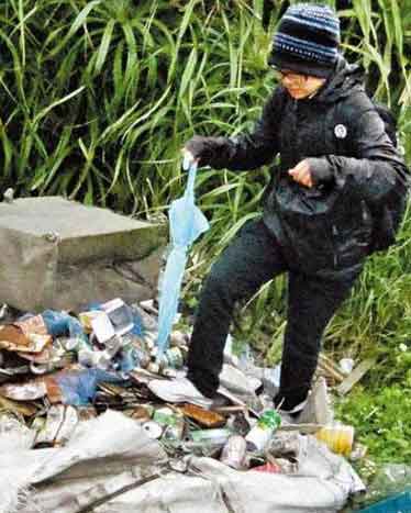 廖乙穎穿梭在垃圾堆中搜集材料,自嘲是流浪婆。圖片來源:臺灣《蘋果日報》
