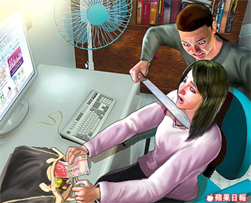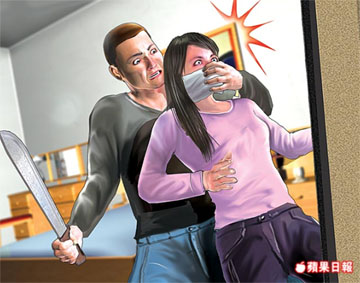 陳映彤在家上網(wǎng)時(shí),被歹徒姜文淵以長(zhǎng)刀抵住脖子,喝令她拿出錢,她從皮包里拿出港幣和信用卡給姜文淵。 來(lái)源:臺(tái)灣《蘋果日?qǐng)?bào)》