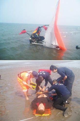 輕航機墜落后整個插在沙洲上,座椅、零件則散布水面,困在機上的陳男連忙打電話通知太太、同事;趕到現場的同事先將他背到500米外較淺的沙洲上,但因出事地點距離岸邊約3公里,又遇海水開始漲潮,警消獲報后涉溪、小跑步,約快半小時才到達沙洲,隨即將陳男送醫,所幸僅右側股骨及脛骨骨折。