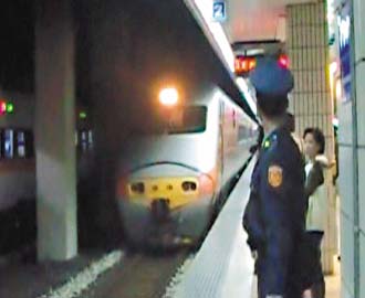 前日晚間臺鐵1039次自強(qiáng)號列車,司機(jī)員林宜賢突血壓飆高,緊急求助;緩緩進(jìn)入臺北車站時(shí),月臺上有不少旅客,鐵路警察早在一旁戒備。圖片來源:臺灣《聯(lián)合報(bào)》