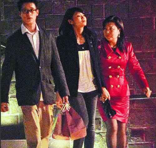 婚宴結束,蔣友青(左)、長腿妹和媽媽蔣方智怡準備搭車離去。圖片來源:臺灣《蘋果日報》