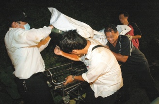 臺北縣爆發警消人員涉嫌與殯葬業者勾串大賺死人錢案,檢方昨天約談涉案人到案。圖為一般業者搬運、處理浮尸遺體情形。圖片來源:臺灣《聯合報》