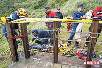 女士疑吞藥、淋油自焚跳崖身亡,警察將遺體從200深谷吊上來。(圖片來源:臺灣《蘋果日報》)