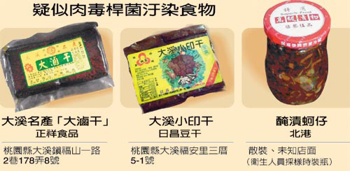 臺當局“衛生署”表示,3年前曾有一名67歲老人不幸肉毒桿菌中毒死亡病例。本周二才發布今年首起肉毒桿菌群聚中毒事件,是一對桃園縣母女食用真空包裝素豆干、素蹄筋、素肚而中毒,仍在插管治療,昨晚再發布另一對婆媳疑似中毒,中毒的是72歲婆婆鄭玉蘭和46歲媳婦蔡錦如。