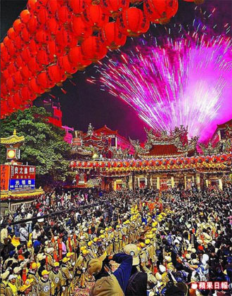 臺中縣大甲鎮(zhèn)瀾宮媽祖繞境活動,規(guī)模一年勝一年。鎮(zhèn)瀾宮維持往年“藍綠平衡”慣例,今年由馬英九、臺當局“行政院長”吳敦義恭迎媽祖神像上轎;晚上11時,媽祖起駕,國民黨籍臺中市長胡志強、臺中縣長黃仲生,及民進黨籍大臺中市長參選人林佳龍、高雄縣長楊秋興點起馬炮,最后眾人陪同鎮(zhèn)瀾宮董事長顏清標扶著媽祖鑾轎,步出廟門。