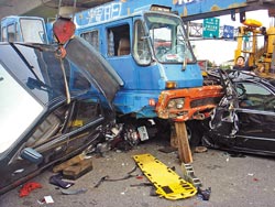 臺中縣清水鎮(zhèn)16日傍晚發(fā)生嚴(yán)重車禍,20噸吊車疑因剎車失靈,連續(xù)追撞12部車,現(xiàn)場多部汽車被撞得如疊羅漢,造成2死6傷慘劇。 來源:臺灣《中國時(shí)報(bào)》