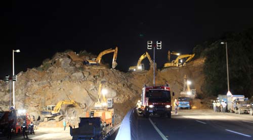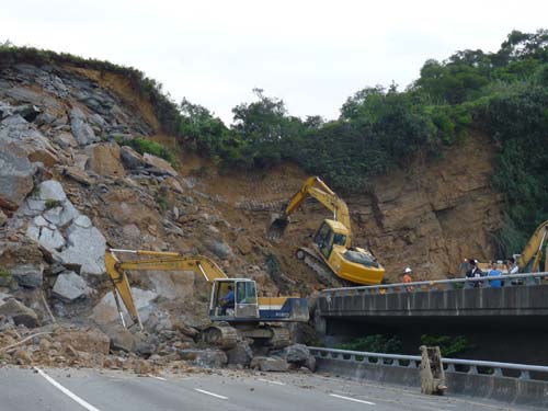 臺灣3號高速公路昨天嚴(yán)重走山,在崩塌處北邊工程單位派出多架挖土機(jī)連夜搶救。(圖:《聯(lián)合報》)