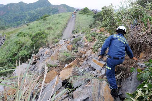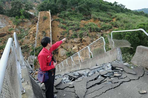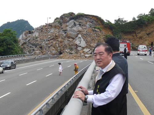 臺灣3號高速公路3.1公里處昨天下午發(fā)生嚴(yán)重山崩意外,基隆巿長張通榮(前者)昨天抵達(dá)現(xiàn)場后,面色凝重。(圖:《聯(lián)合報》)