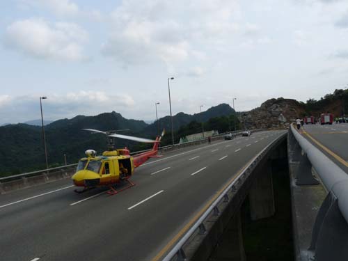 臺當(dāng)局“消防署”空消直升機(jī)昨天罕見地停在因走山而中斷的臺灣3號高速公路上。(圖:《聯(lián)合報》)