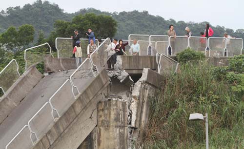 臺灣3號高速公路3.1公里處昨天發(fā)生嚴(yán)重走山意外,南下、北上都被土石流封阻,面積至少有1、2座足球場大,一處人行跨越橋隨之倒塌。(圖:《聯(lián)合報》)