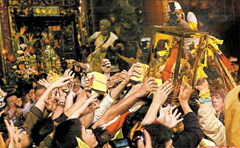 中國(guó)臺(tái)灣網(wǎng)4月27日消息 綜合臺(tái)灣媒體報(bào)道,臺(tái)灣臺(tái)中縣大甲鎮(zhèn)瀾宮媽祖340余公里繞境活動(dòng)前日結(jié)束,據(jù)鎮(zhèn)瀾宮估計(jì),今年參與繞境人數(shù)約120萬(wàn)、香油錢約2400萬(wàn)元(新臺(tái)幣 下同),金牌數(shù)更是達(dá)到1400多面,創(chuàng)下新高。