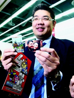 連戰長子、悠游卡公司董事長連勝文將請辭,圖為他出席icash悠游卡發卡儀式時,得意秀出私人訂制的與太太蔡依珊合照的悠游卡。資料圖片